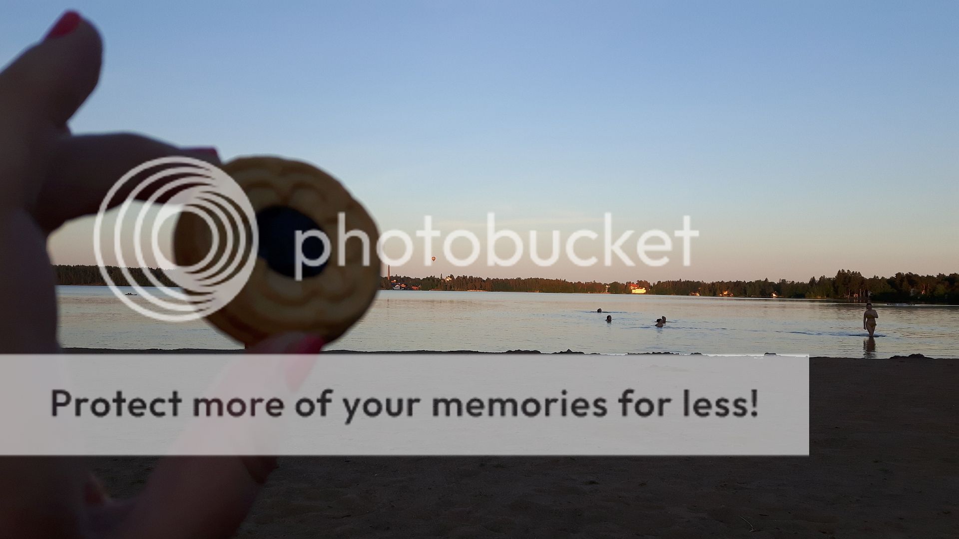 Kotiin päästyäni sain vielä idean. Olin jo jonain aiempana iltana ajatellut, että olisi kiva ajella illalla johonkin veden äärelle, kun on kerran näin lämmintä. Suunnittelinkin sitten iltareissun läheiselle järvelle, jonne menevän tien varrella sattumoisin on myös K-Citymarket. Tarkistin vielä K-ruoka-sivustolta, että siellä pitäisi olla näitä keksejä. :keijo: Lähdin yhdeksän jälkeen ajelemaan sinne ja löysinkin Cittarista keksejä. (Muuten siellä meni liikaa aikaa, kun yritin ostaa samalla muutamaa muuta asiaa, kun nyt hypermarkettiin saakka olin tullut.) Sitten ajelin marketista eteenpäin järvelle ja istuin rantaan syömään keksin (tai kolme). Kuva eeppisestä keksinmaistosta. Paikalla oli myös vielä puoli kylää uimassa, vaikka oli myöhä (ei ihme kun on näin lämmin), sekä lauma lokkeja, jotka varmasti olisivat mieluusti halunneet myös osallistua keksinmaistokeksiviikkoon. :keijo: